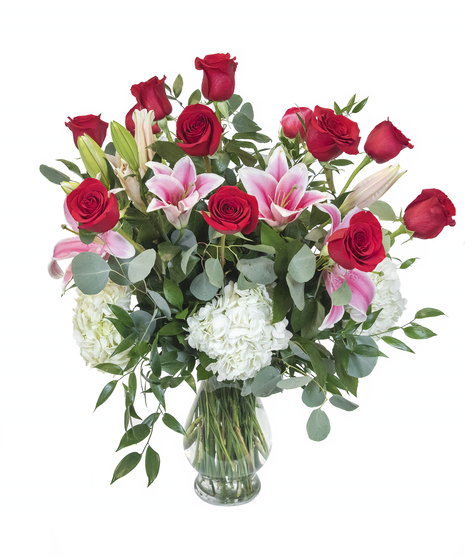 Our 'All My Love' arrangement is designed with long stem red roses, fragrant pink lilies and white hydrangeas in a tall, clear glass vase. A classic design.